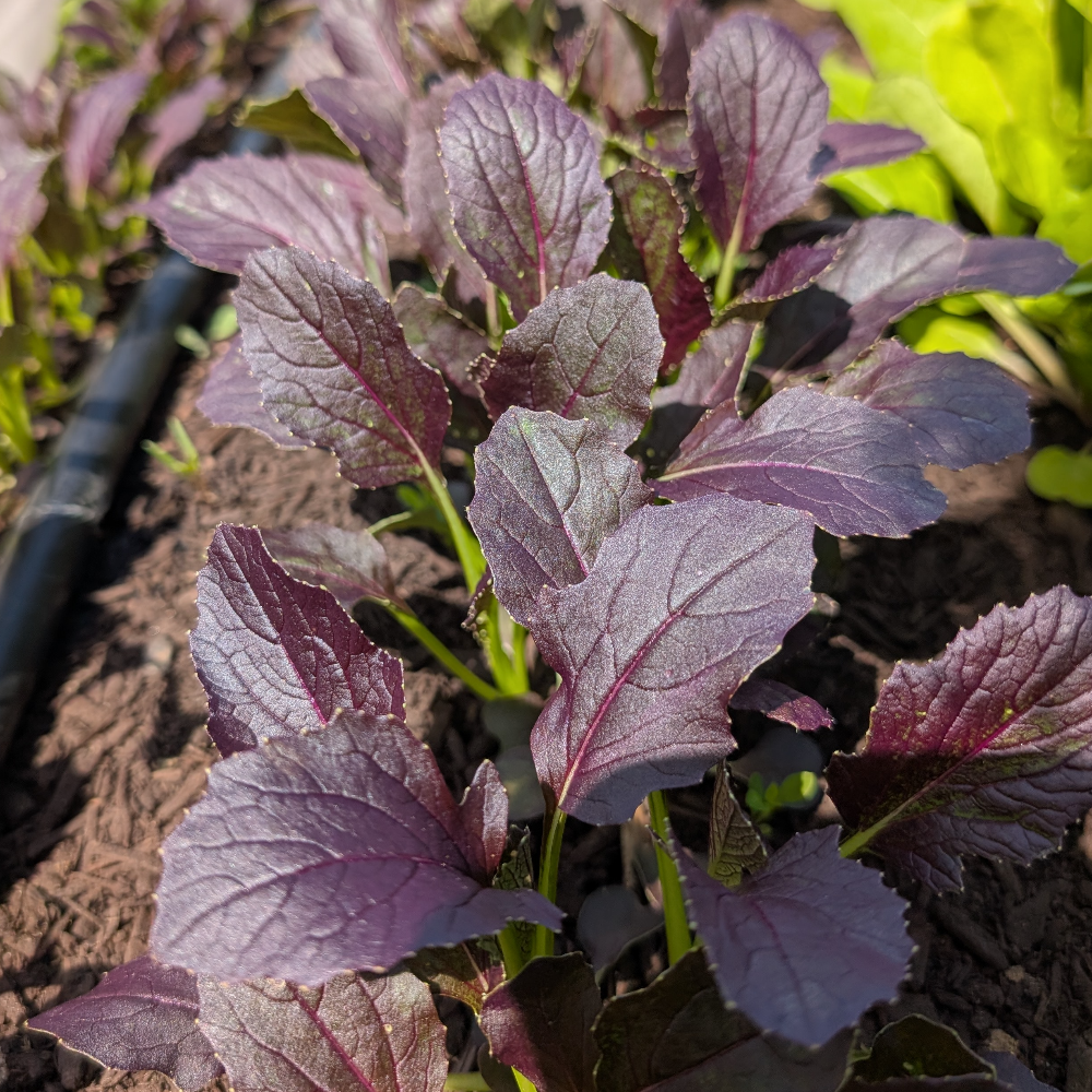 Small red leaves without the characteristic spiciness of most mustards. Ideal in salads or sandwiches. Expect a few holes, as this crop is grown without pesticides.